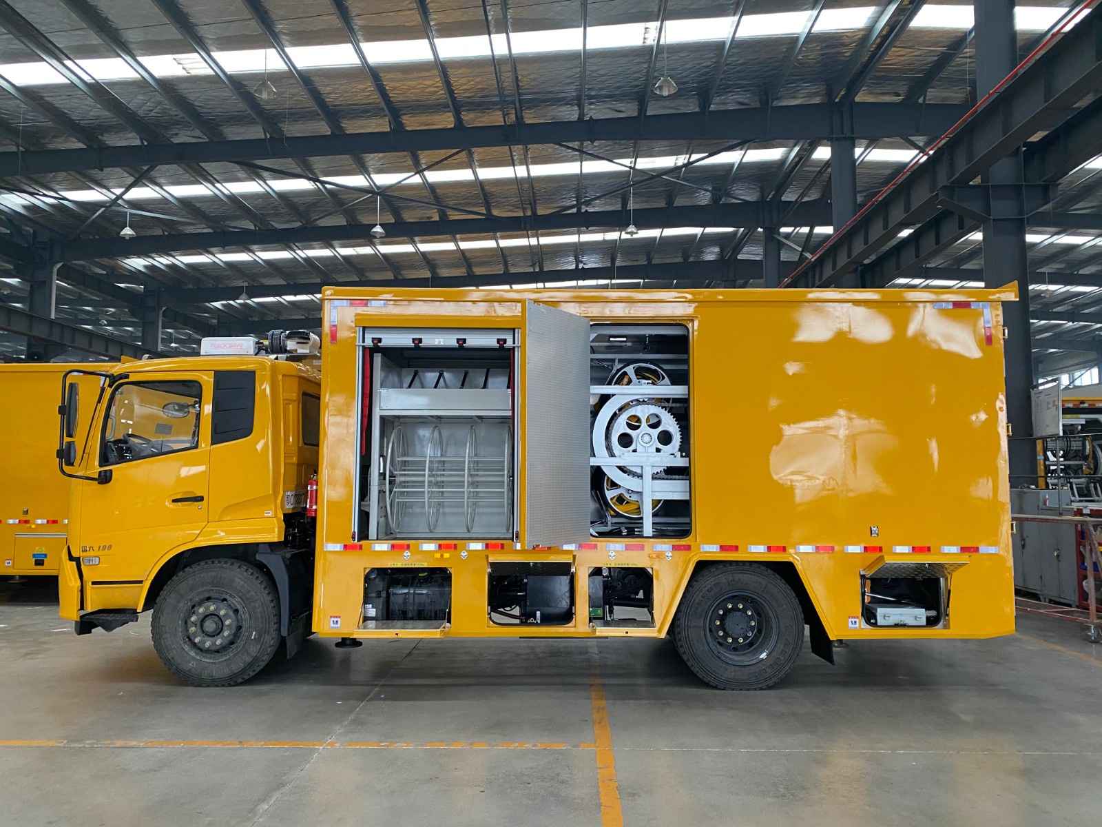 旁路作业车主要由汽车底盘、厢体、工具货架、自动收放装置等组成,具备存放、运输及自动收放900米10kV高压柔性电缆功能,可与移动箱变车、移动环网柜车相互配合作业,广泛运用于旁路不停电作业项目。