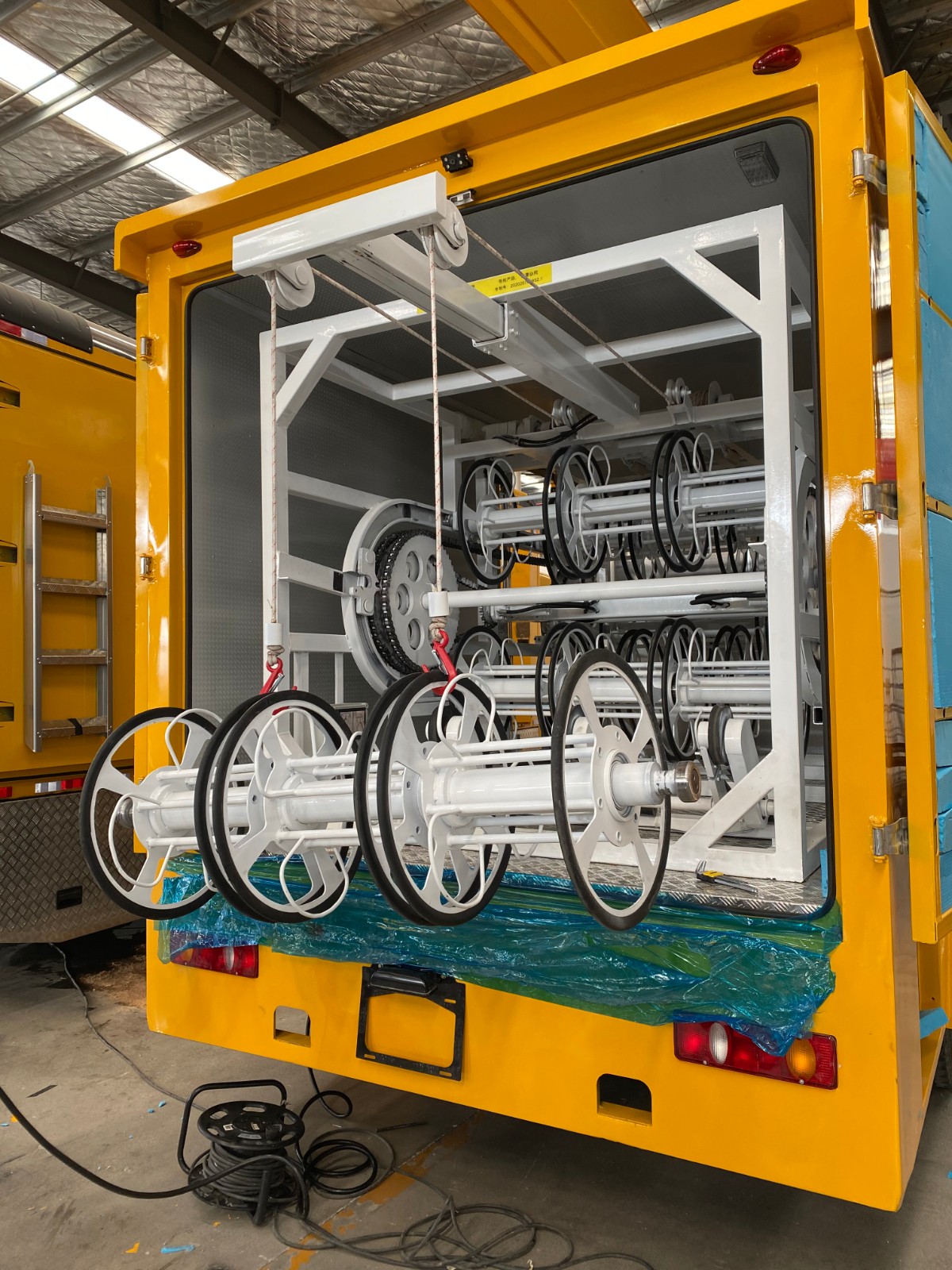 展放机构可满足放置旁路电缆50米/盘、共18盘、900米,实现对电缆线轴(3盘为一组)的同时同轴自动电缆收放。
